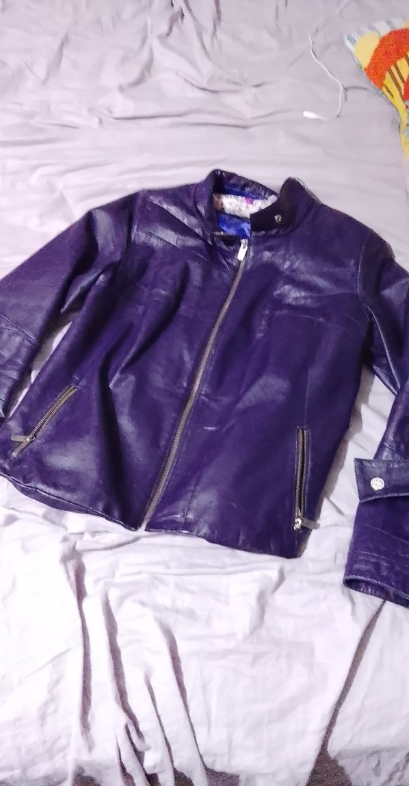 Mor deri biker ceket, parlak yüzeyli ve dar kesimlidir. Fermuarlı cepleri, kesik yaka ve uzun kollarıyla günlük sokak stiline uygundur.