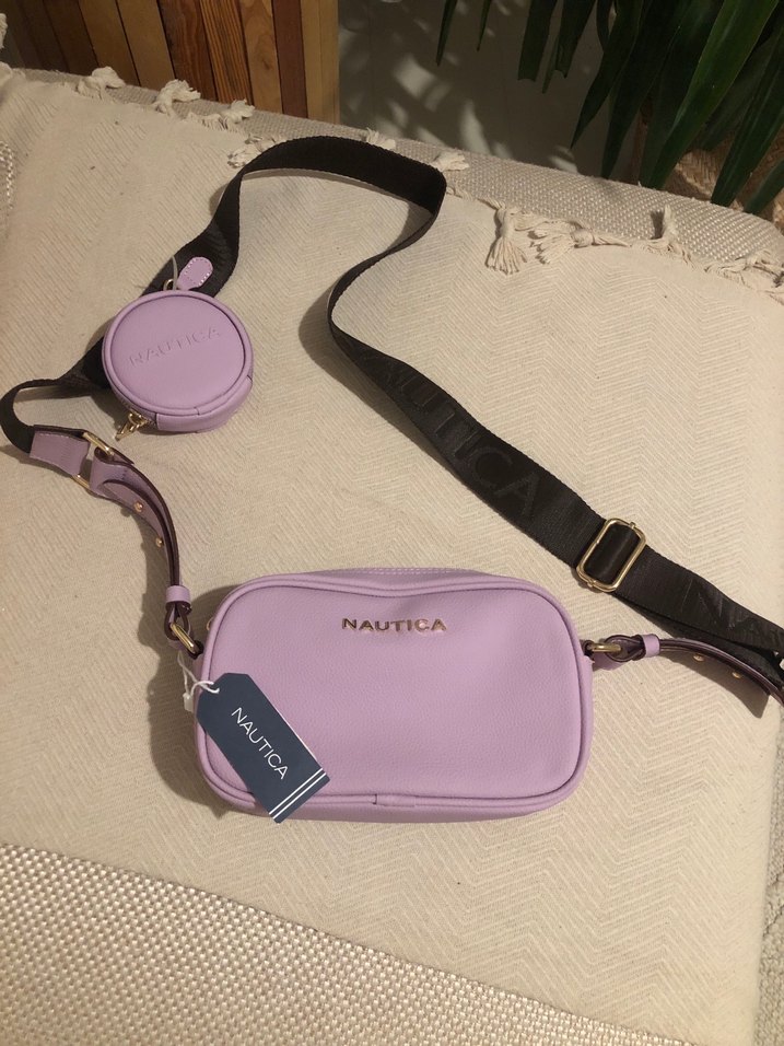 Nautica marka, pastel mor renkte deri çanta. Ayarlanabilir kahverengi askı ve çıkarılabilir küçük bozuk para cüzdanı içerir. Günlük kullanıma uygun. Etiketli, hiç kullanılmamıştır.