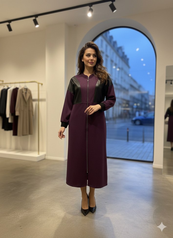 Mor renkli, deri detaylı uzun elbise, etnik desenli ve uzun kolludur. Notlu yaka ve önden fermuar özelliğiyle, ofis için uygun modest bir tarza sahiptir. 38-42 beden aralığında 1 kez kullanılmıştır