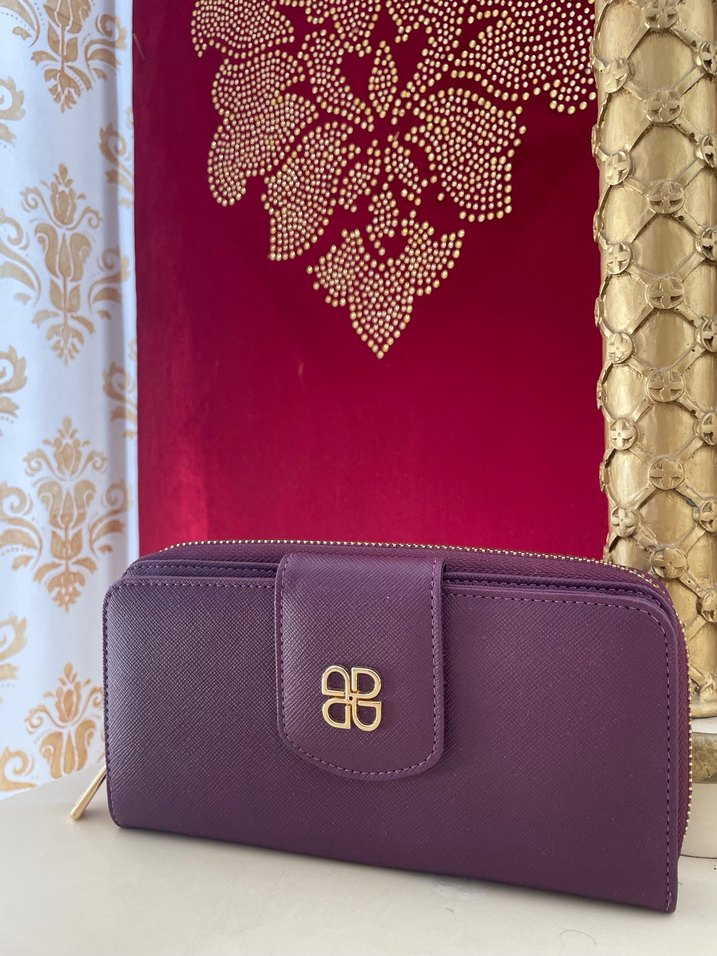 Mor deri kadın cüzdanı, fermuarlı kapama ve baskılı deseniyle modern klasik Paris tarzını yansıtıyor. "88" detaylı, günlük kullanıma uygun.