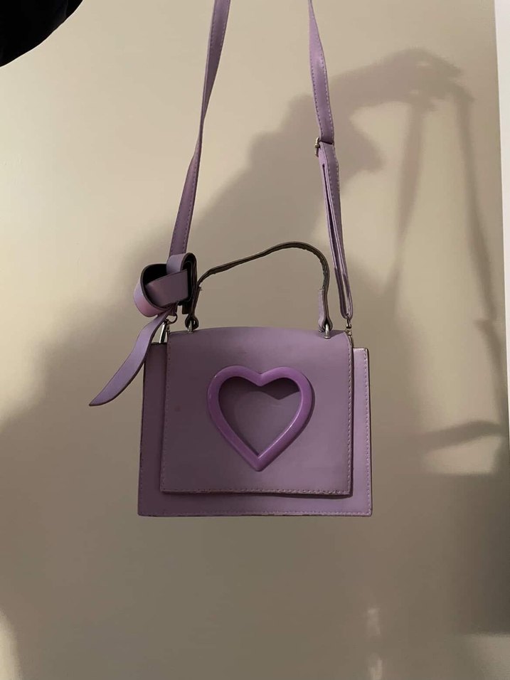 Pastel mor deri çanta, kalp desenli ve tokalı askılıdır.