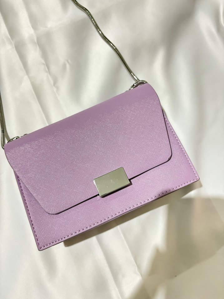 Pastel mor deri kadın çanta, tokalı kapak ve desenli dokusuyla modern klasik tarzda, günlük kullanıma uygun.