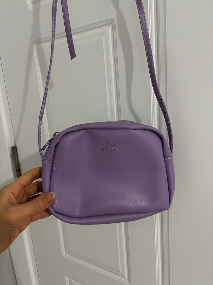 Mor deri, tokalı askıya sahip kadın çapraz çanta. Minimalist ve desensiz tasarımıyla günlük sokak stiline uygundur. Hiç kullanılmadı.