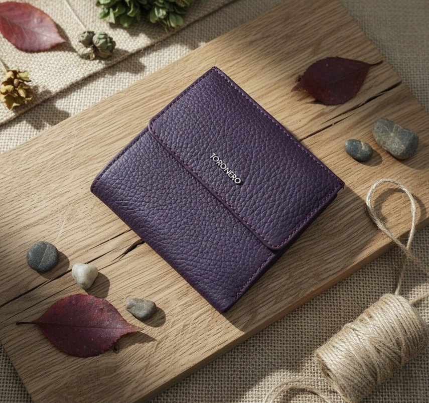 Kilitli, dokulu deriden yapılmış koyu mor kadın cüzdanı. Minimalist ve sade tasarımıyla günlük kullanıma uygundur. Desensiz ve temel stilde bir üründür.