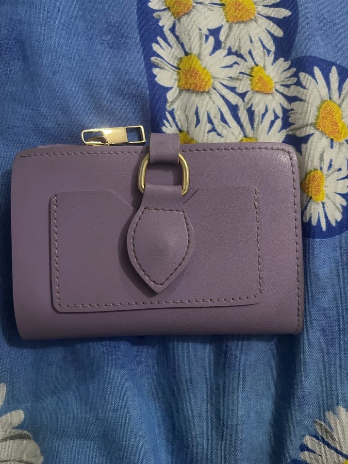 Pastel mor renkte, tokalı deri kadın cüzdanı. Minimalist tarzda, baskılı desenli ve günlük kullanıma uygun.