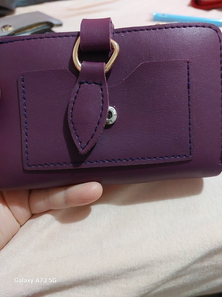 Mor deri kadın cüzdanı, parlak yüzeyli ve tokalı detaylı, minimalist tarzda günlük kullanıma uygun.