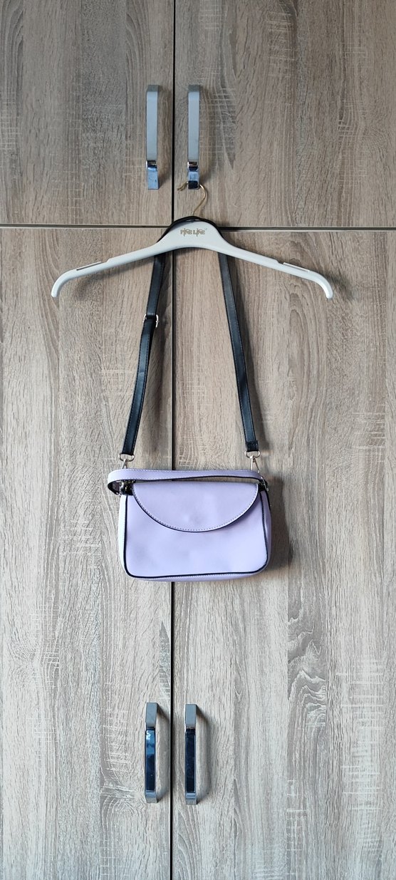 Pastel mor renkte deri, kemerli ve desen içermeyen kadın çantasıdır. Trend sokak modasına uygundur.