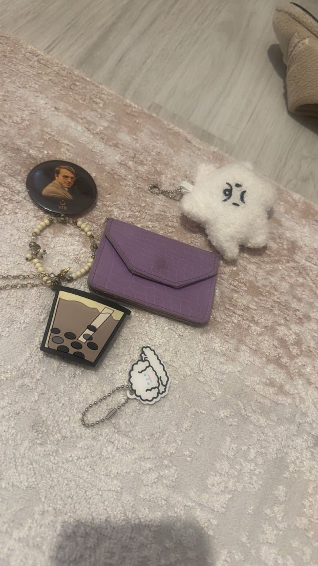 Püskül detaylı pastel mor deri mini cüzdan ve balon çay ile peluş figürlü eğlenceli anahtarlıklar. Trend belirleyenler için uygun.