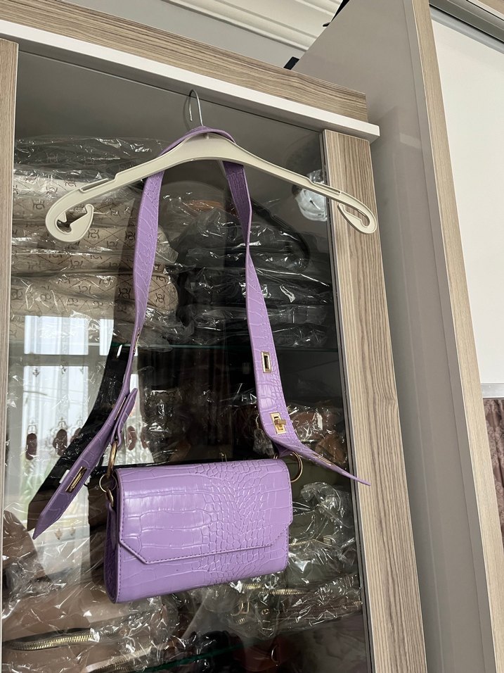 Pastel mor renkte, deri yılan desenli ve tokalı askılı Paris sokak modası tarzında kadın çantası.