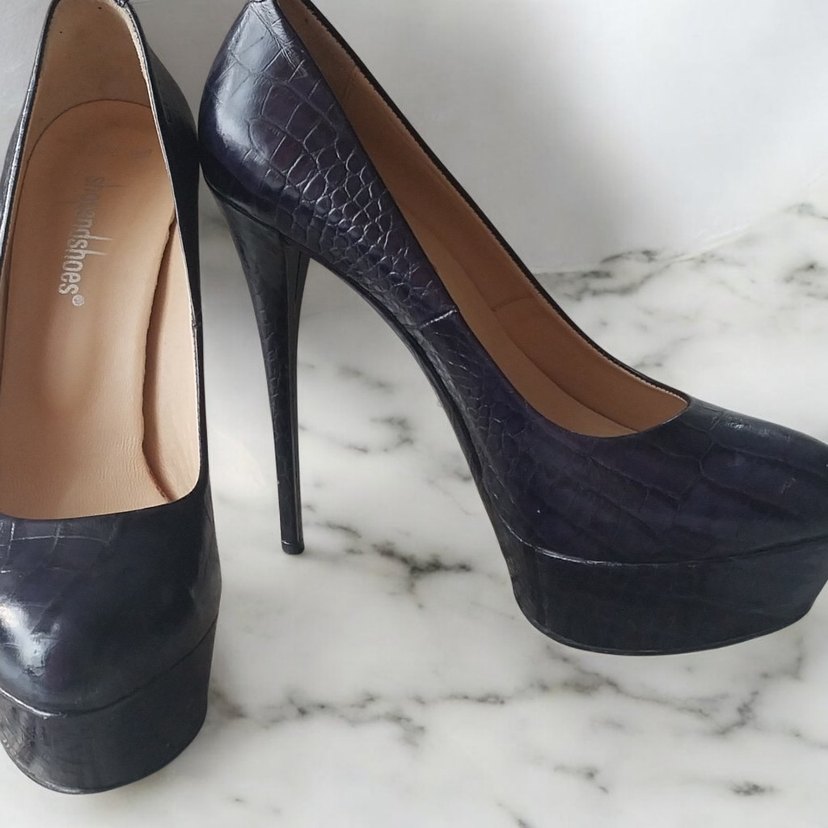 Mor deri yılan desenli stiletto ayakkabılar, platform topuklu ve tokalı detaylara sahiptir, romantik buluşmalar için uygundur.