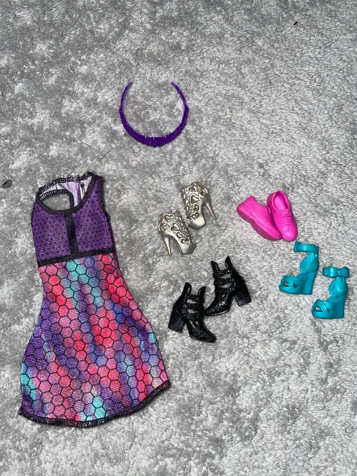 Mor Desenli barbie elbisesi ve ayakkabılar