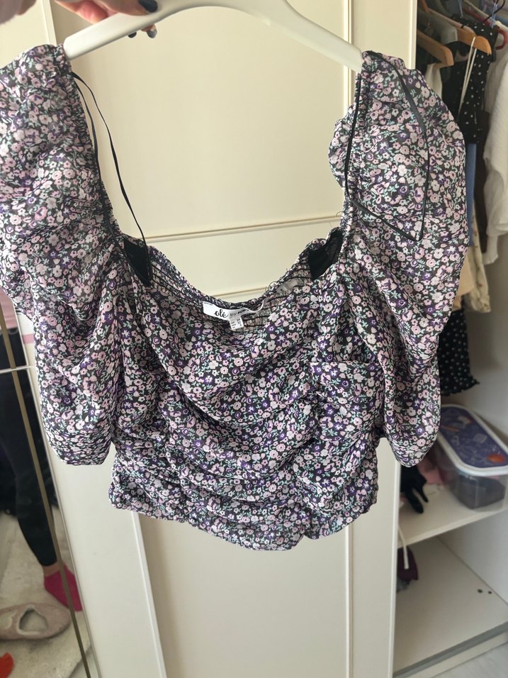 Mor renkli, straplez yaka ve askılı kısa mini bluz, drapeli