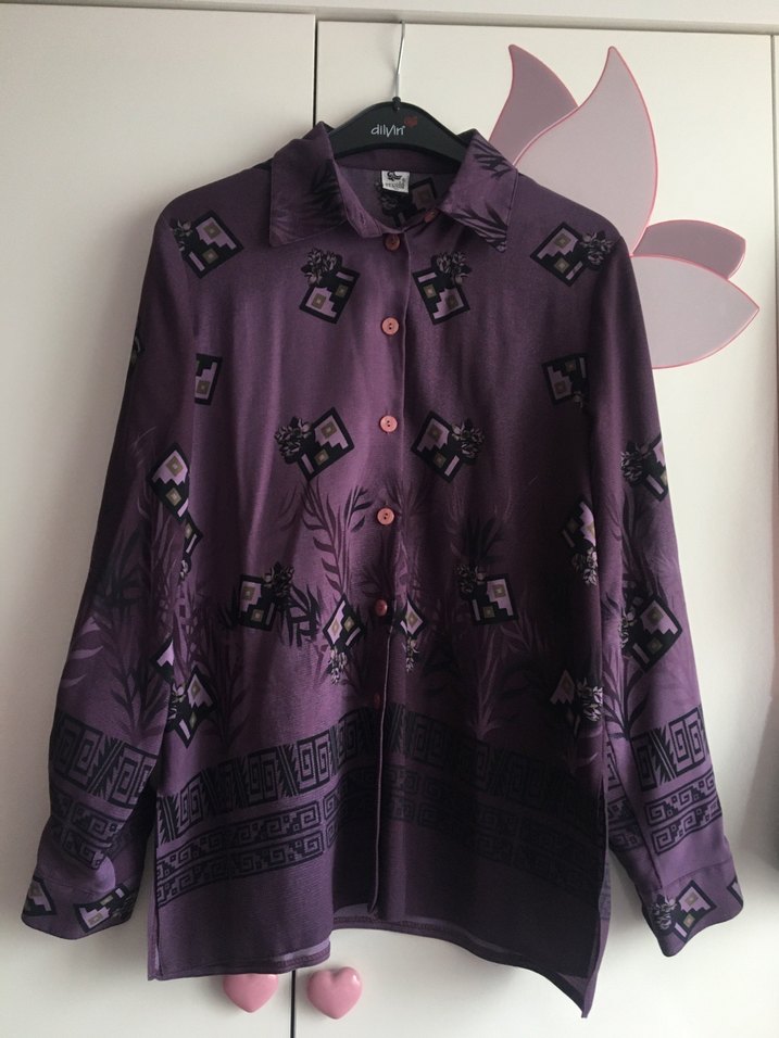 Mor renkli, ipeksi dokulu kadın gömlek, düğmeli ön, uzun kollu ve bol kesimdir. Notlu yakası ve vintage bohem desenleriyle midi boyda, günlük kullanıma uygundur.