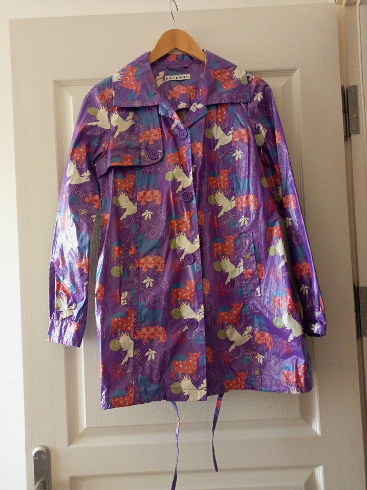 Renkli batik desenli, düğmeli ve yakalı yağmurluğu. Su geçirmez,terletmez kumaş bol kesim ve bohem tarzda tasarlanmıştır. S beden için de uyumlu.tek yakada (son foto)nokta gibi bir iki yerde atma var.kisa süre kullanılıp dolap bekleyen.yurt dışı ürünü
