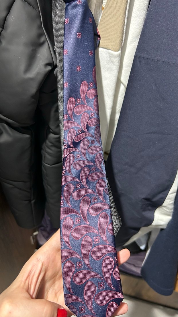 Erkek kravatı, koyu mor zemin üzerinde detaylı paisley desenine sahiptir. Klasik iş stilini sokak modasıyla birleştirir.