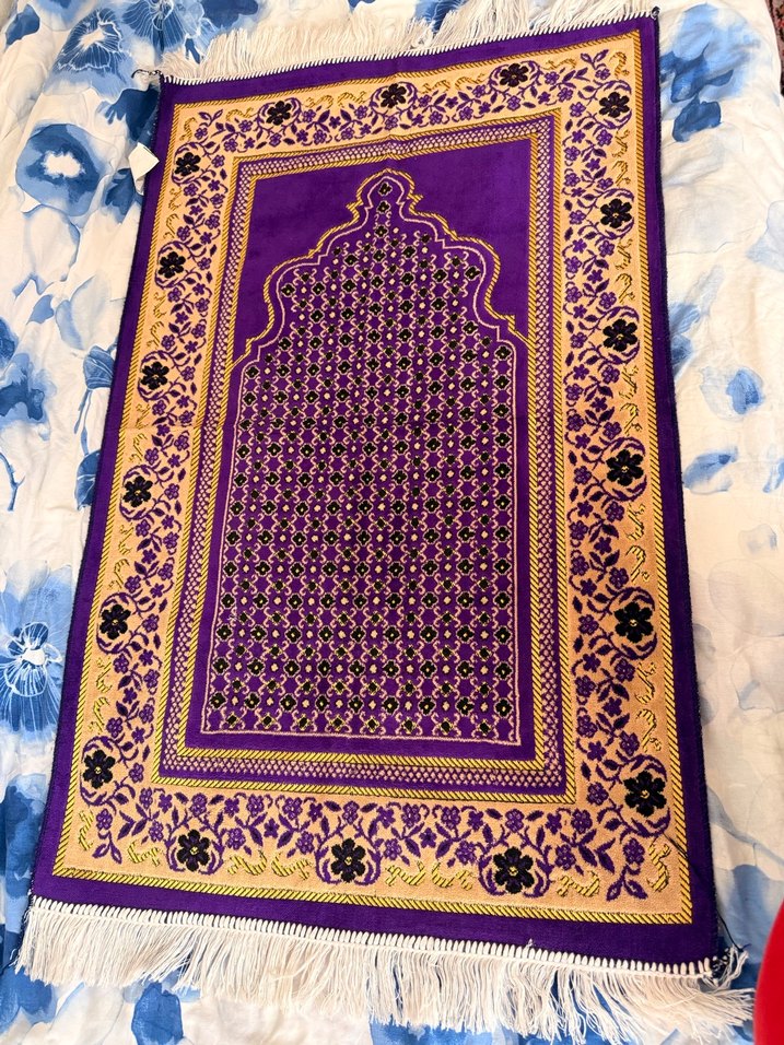 Mor renkli, renkli desenlere sahip geleneksel tarzda, püsküllü dekoratif halı seccade Her odaya klasik bir dokunuş katar.