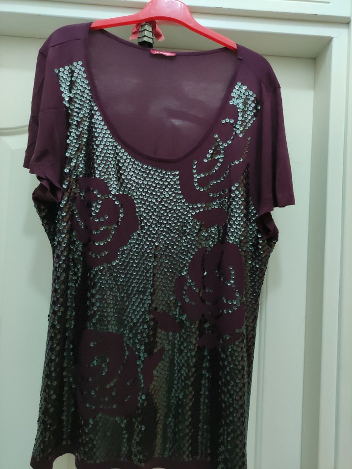 Mor renkli, desenli, kısa kollu ve bol kesim kadın bluz. Drapeli tasarımıyla bohem gotik parti stiline uygundur.