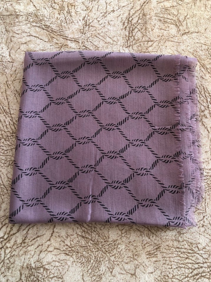 Mor renkte, dantel detaylı ve gri geometrik desenli sentetik kumaştan bohem tarzda kadın eşarp