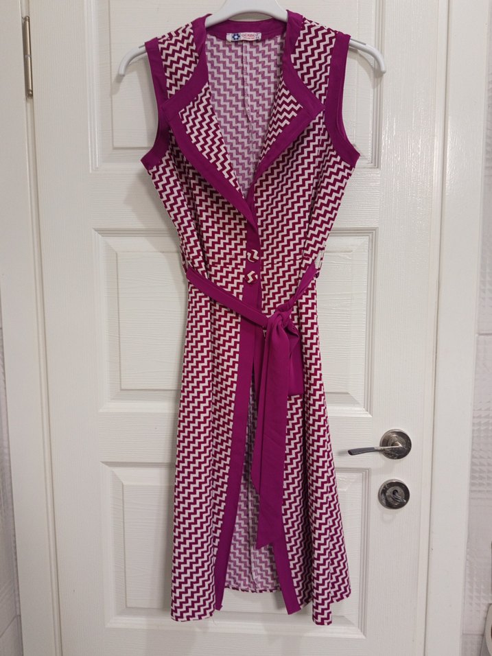 Kemerli, notched lapel yaka ve askılı kollara sahip, koyu mor tonlarında desenli uzun triko elbise. Yumuşak sentetik kumaştan üretilmiştir.