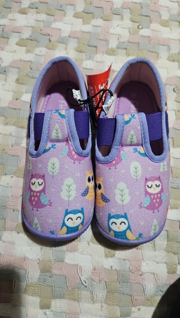 Mor renkte, renkli baykuş desenli kız çocuk terliği. Kaymaz kauçuk taban ve ayarlanabilir velcro bant içerir. Trend sokak stili için uygundur.