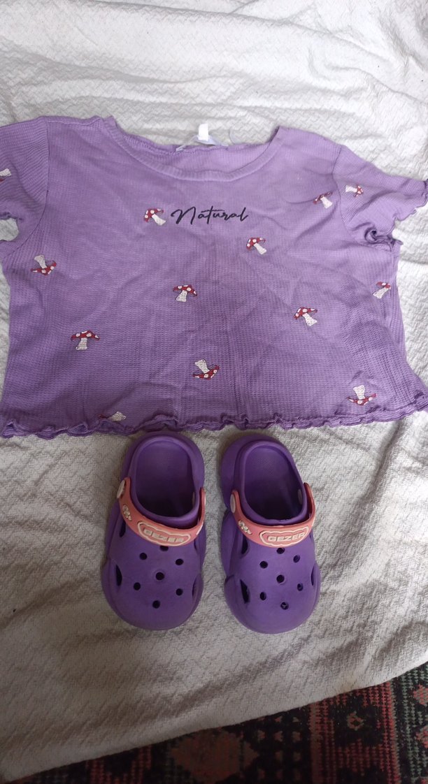 Baskılı mantar desenli, fırfırlı pastel mor kız çocuk tişörtü ve uyumlu mor terlikler seti.