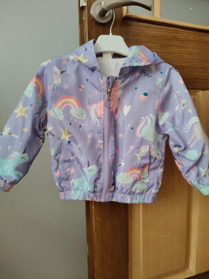 Mor tonlarda, unicorn ve gökkuşağı desenli kız çocuk yağmurluğu. Fermuarlı rahat kesim.