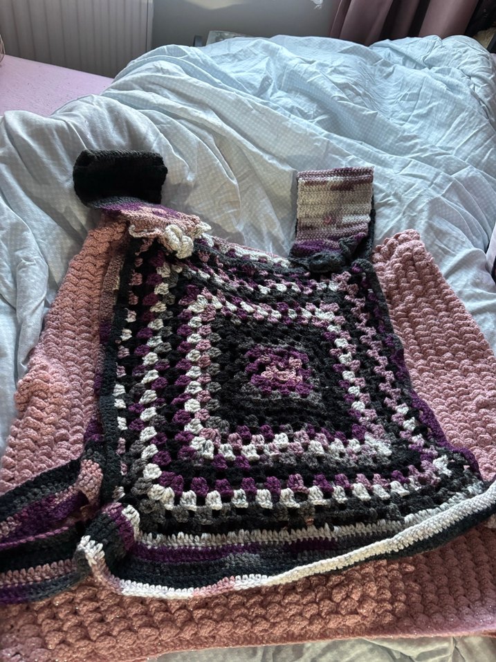 Mor ve krem tonlarında desenli, dokulu örgü tasarıma sahip koyu mor yelek.