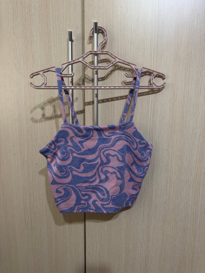 Mor bağlama desenli, örme dokulu, straplez ve kolsuz, kısa ve vücuda oturan crop top. Sokak stili için uygun bir parça.
