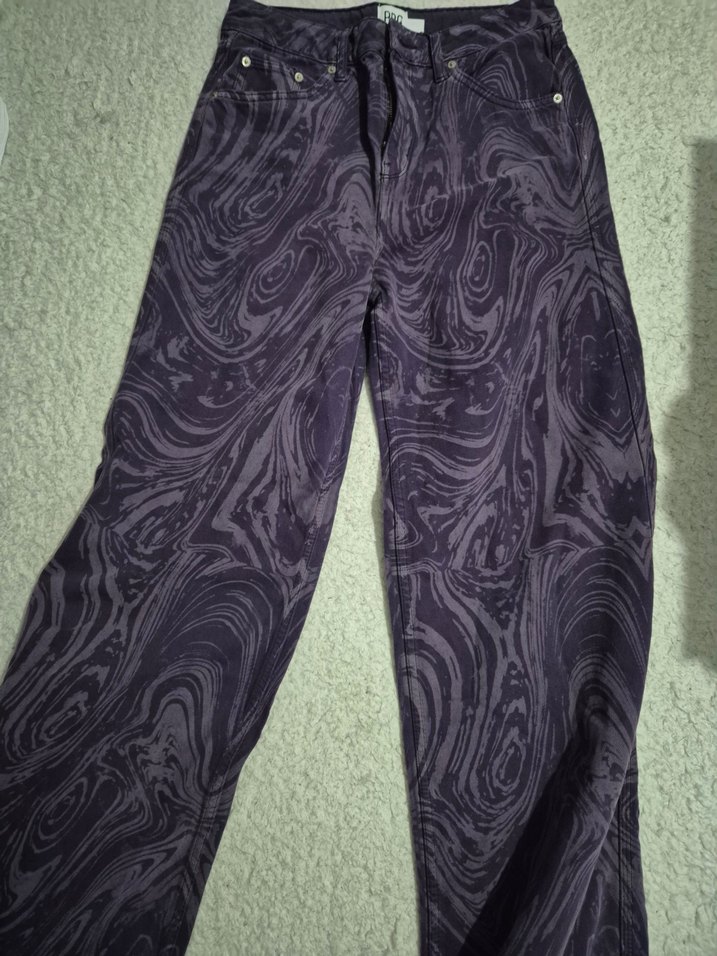 Mor desenli, salaş kesim ve dökümlü kadın jean. günlük sokak stili için uygun. hiç giyilmedi yeni bel ölçüsü 35 basen 45 cm