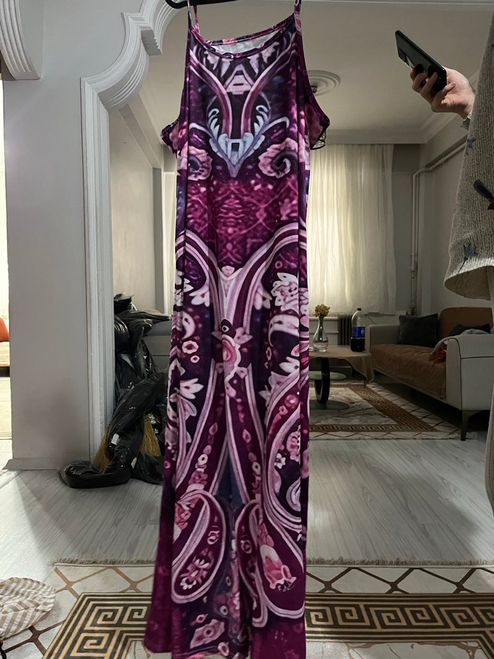 Mor Desenli Salaş Uzun Elbise
