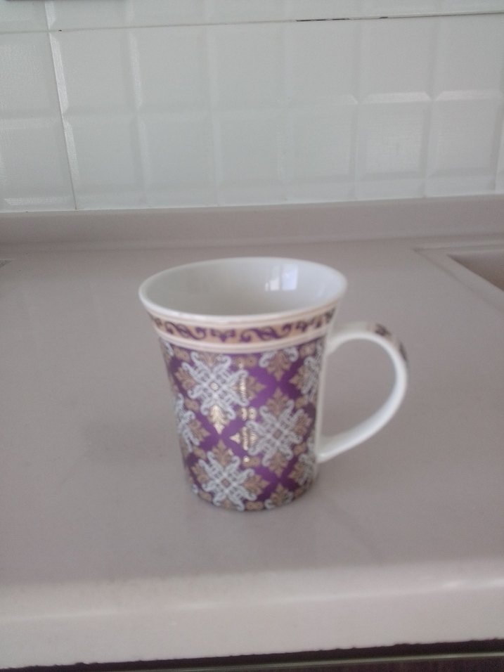 Bu seramik kupa, mor renkli ve detaylı desenlere sahip, sıcak içecekler için uygundur. ☕