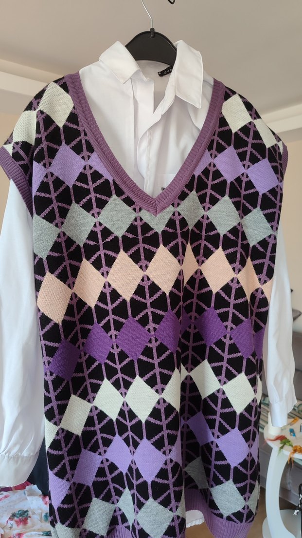 GÖMLEK Lİ DİR. İKİSİDE SIFIR GÖMLEĞİN DÜĞMELERİ YANINDA GÖNDERİLECEKTİR İSTEYEN BAŞKA DÜĞME DE DİKEBİLİR .V yaka, kolsuz, bol kesim triko süveter. Pastel mor renk #süveter #tesettürsüveter #beyazgömlek #nakışlıgömlek #gömlek #triko #trikosüveter #kolçantası