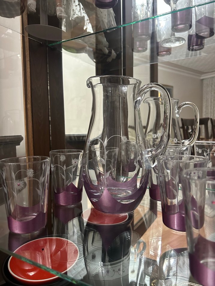 Şeffaf cam sürahi ve 6’lı su bardağı, koyu mor detaylar ve çiçek desenleri ile. Bardakların ve sürahinin tabanında mor renk bulunur.
