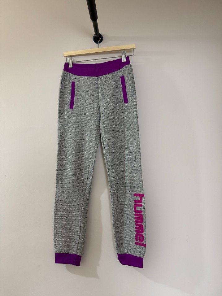 Mor detaylı gri kadın jogger eşofman, fermuarlı cepleri ve baskılı "hummel" logosu ile yumuşak ve sıcak kumaştan üretilmiştir.