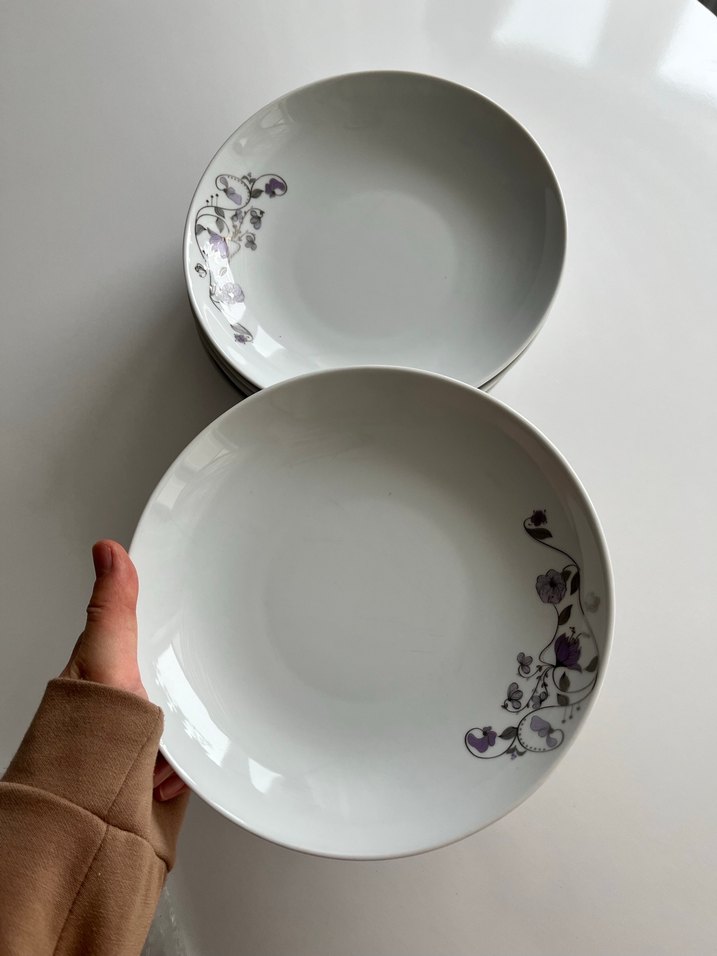 Mor çiçek desenli gri yemek tabakları, pürüzsüz yüzeyli ve yemek servisinde kullanıma uygun. Birden fazla tabak içerir. ️