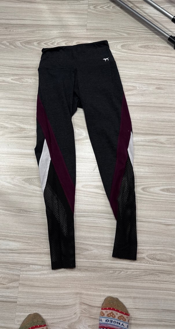 Mor detaylı, elastik bel bantlı, uzun boy kadın spor tayt. Koyu renkli sentetik kumaştan, spor ve günlük kullanım için uygun.Orjinal mağazasından alındı küçük geliyor temizdir