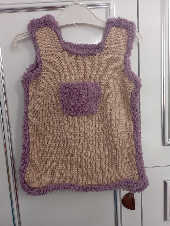 Kız çocuklar için kolsuz, bol kesim triko elbise. Kenarlarında ve cepte pastel mor detaylar bulunur. Yuvarlak yaka ve sade desene sahiptir.