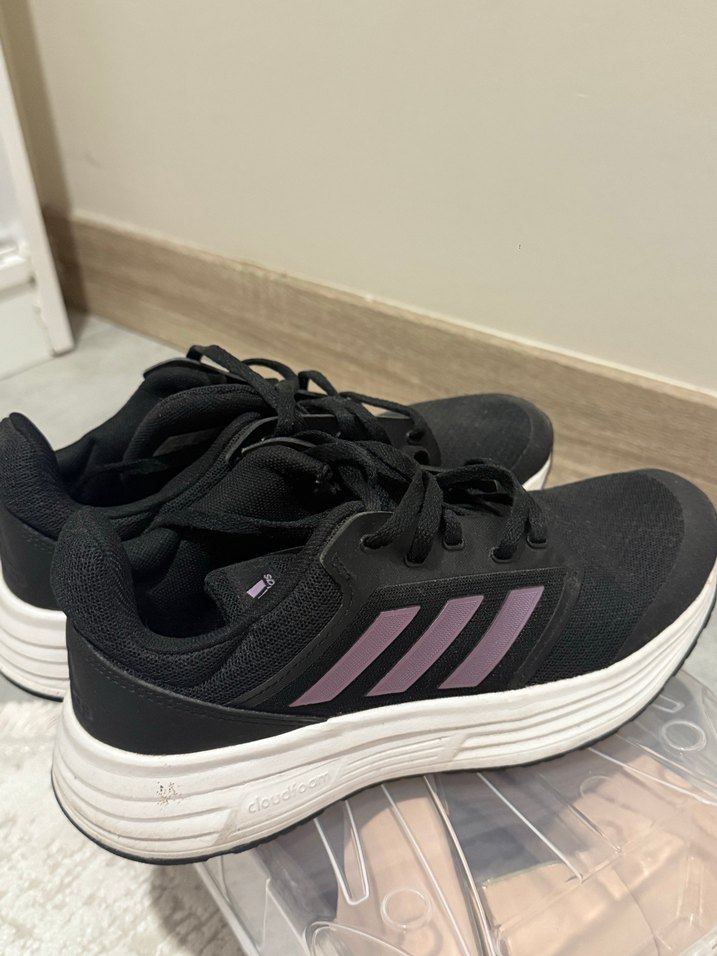 Bir iki kere giydim . Yurt dışından hediye geldi orijinal . Mor şeritli siyah kadın spor ayakkabısı, beyaz kauçuk tabanlı ve bağcıklı yapıda. Spor ve sokak tarzı için uygundur.