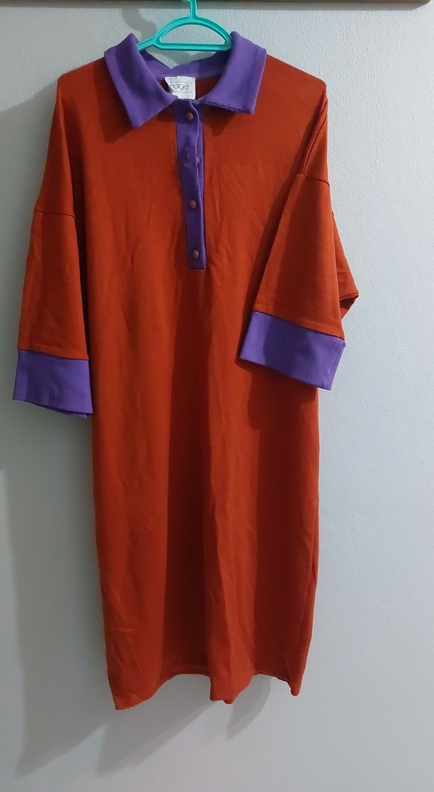 Mor yakalı ve düğmeli detaylı, turuncu renkli, kısa kollu, salaş kesim midi elbise, rahat ve renkli günlük stil sunar.
