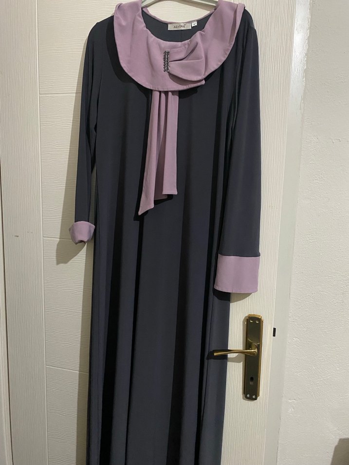Mor detaylı, drapeli halter yaka ve uzun kollu, uzun boy modest elbise, yumuşak sentetik kumaştan üretilmiştir.