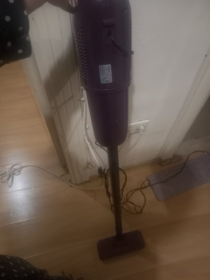 Koyu mor renkli, ince tasarımlı, kablolu elektrikli dikey süpürge, etkili zemin temizliği sağlar.