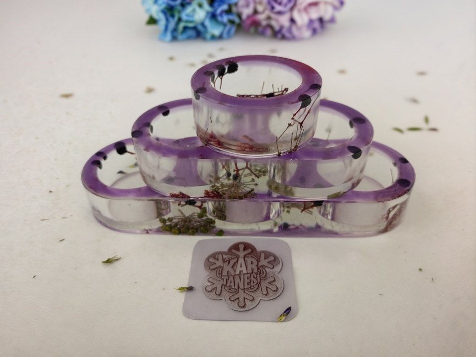 Doğal çiçeklerin şeffaf reçine içinde yer aldığı, mor renkte zarif mumluk seti. ❄️