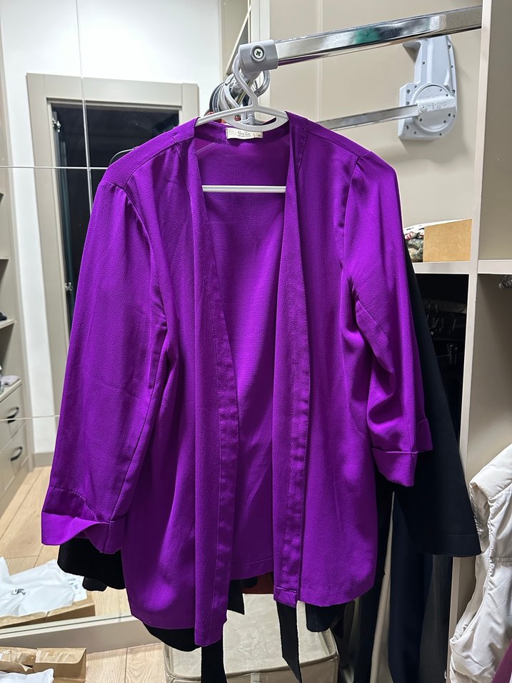 Parlak mor renkte, bol kesim ve uzun kollu kadın dökümlü ceket. Midi normal uzunlukta ve desensiz