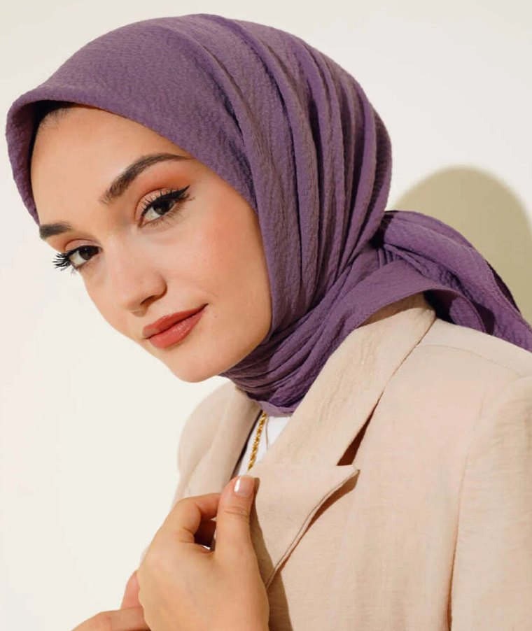Pastel mor renkte, dökümlü ve ipeksi kumaştan kadın şal, sade sokak modası için uygundur.