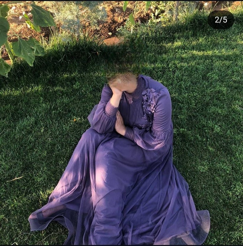 Mor renkte, dökümlü ve uzun kollu, yüksek yakalı, kadın abiyesi, düğün ve avangard tarz için uygundur.