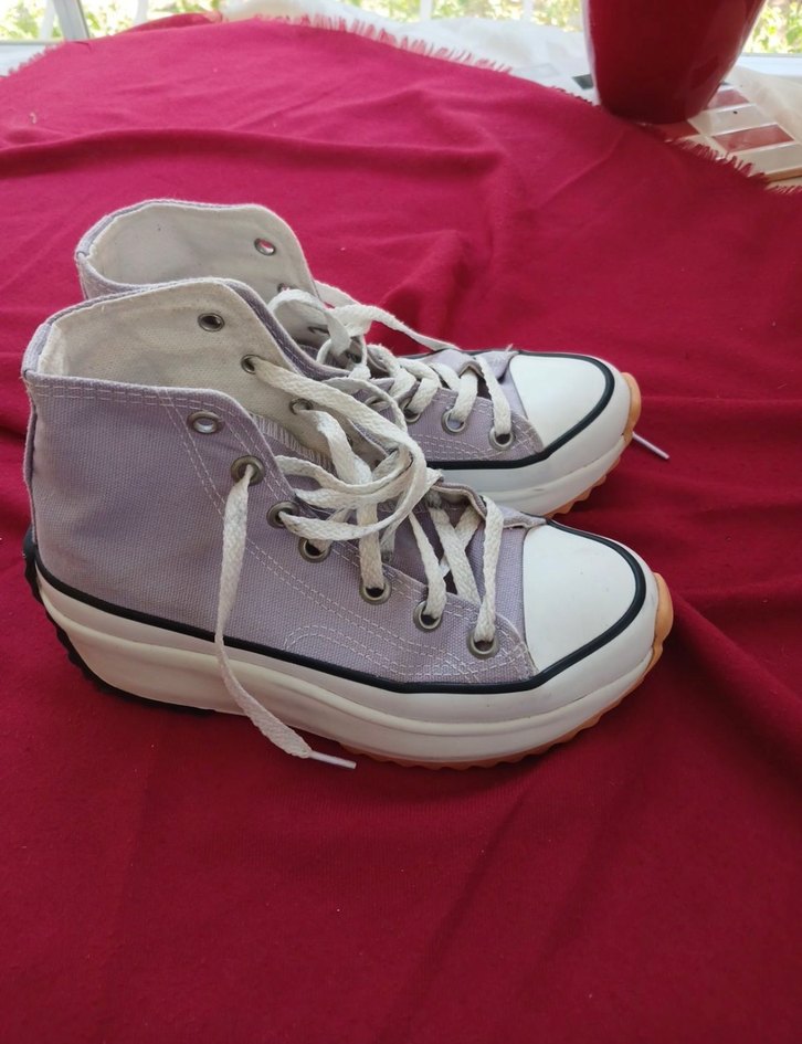 Mor dolgu topuklu kadın spor ayakkabısı, kauçuk tabanlı, zahmetsiz şıklık için sokak stiline uygun ve günlük kullanıma ideal. Pastel tonlu, trend bir görünüm sunar.