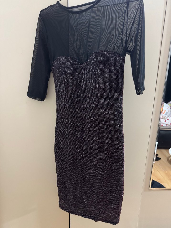 Mor drapeli gövde ve şeffaf siyah kısa kollu, V yakalı, vücuda oturan midi elbise. Romantik bir akşam için uygun.