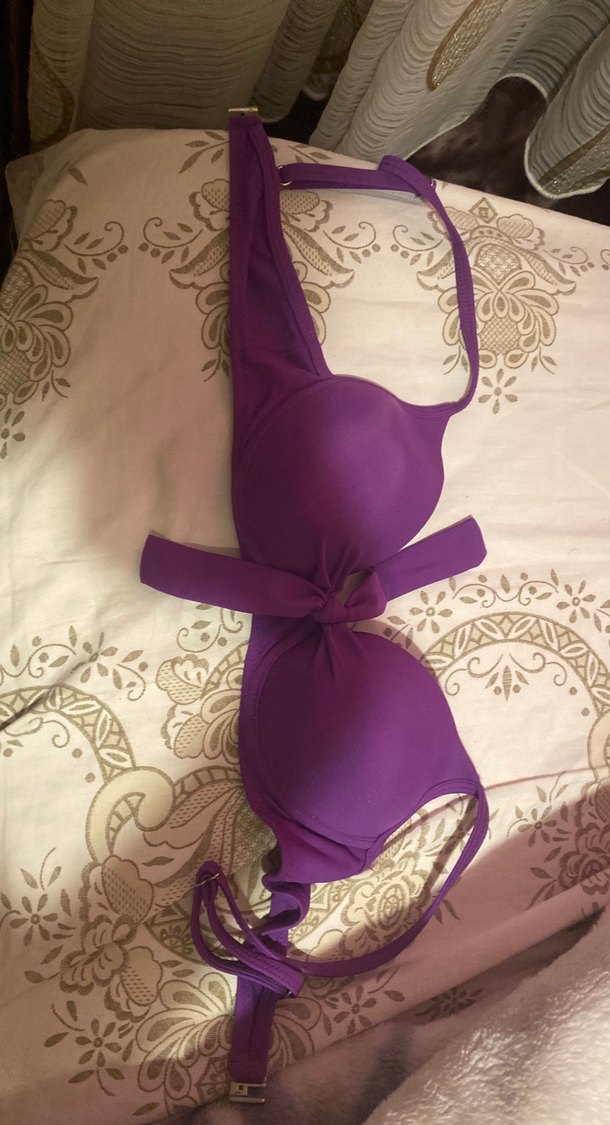 Mor renkte, ince askılı ve drapeli tasarıma sahip, bağcıklı ve sade bohem tarzda fitted bikini üstü.