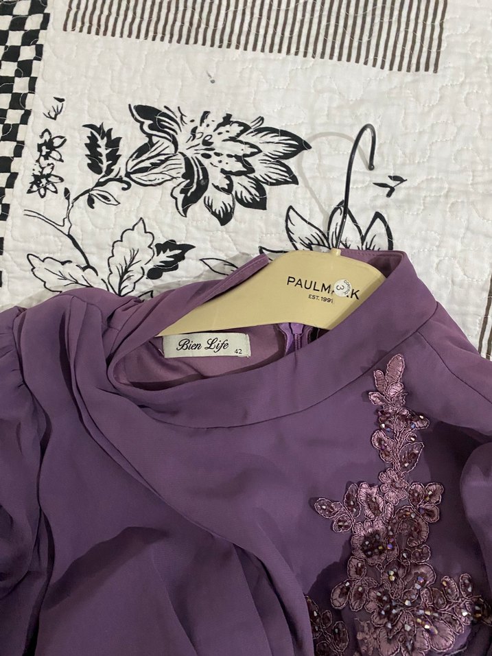 Uzun, bol kesim mor bluz, parlak kumaş, drapeli yüksek yaka ve nakış detaylarıyla bohem düğün stiline uygun. ✨