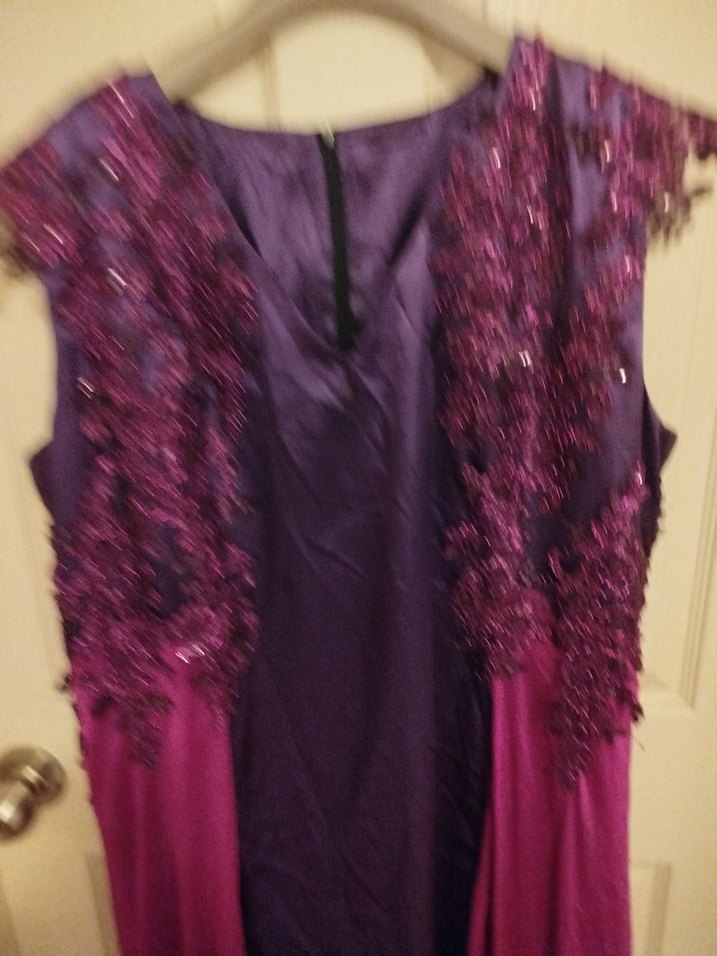Fitted kesim, V yaka ve kolsuz mor uzun abiye elbise. Drapeli tasarım ve işlemeli detaylarla avant-garde, gotik partiler için uygun.